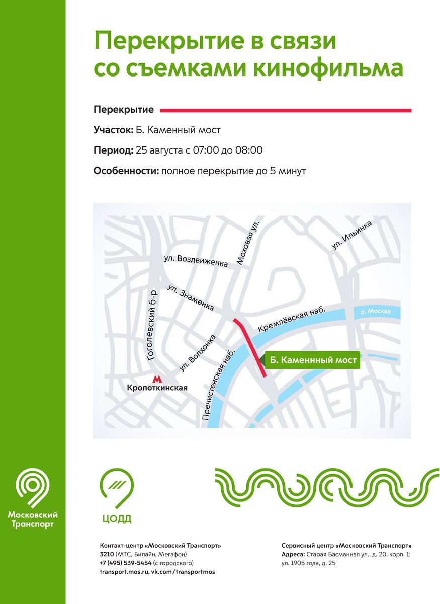 Пройдут киносъемки.Большой Каменный мост в центре Москвы перекроют в воскресенье, 25 августа, для киносъемок, предупреждает ЦОДД.